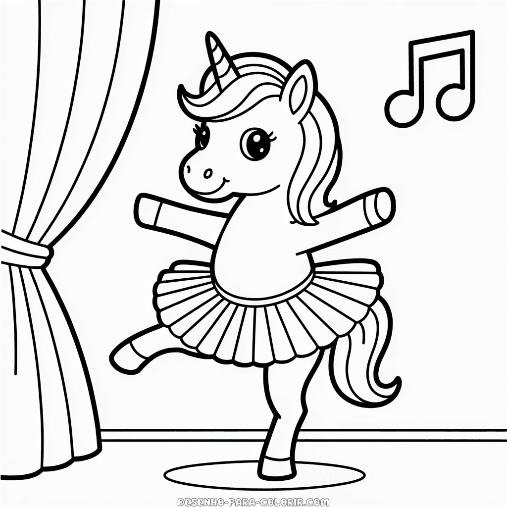 Desenho para colorir grátis de Unicórnio Bailarino, um encantador unicórnio dançando graciosamente. Imprima e colora esta ilustração de um unicórnio com movimentos de balé para crianças. Imagem PNG de alta qualidade, em preto e branco, otimizada para impressão em PDF formato A4.