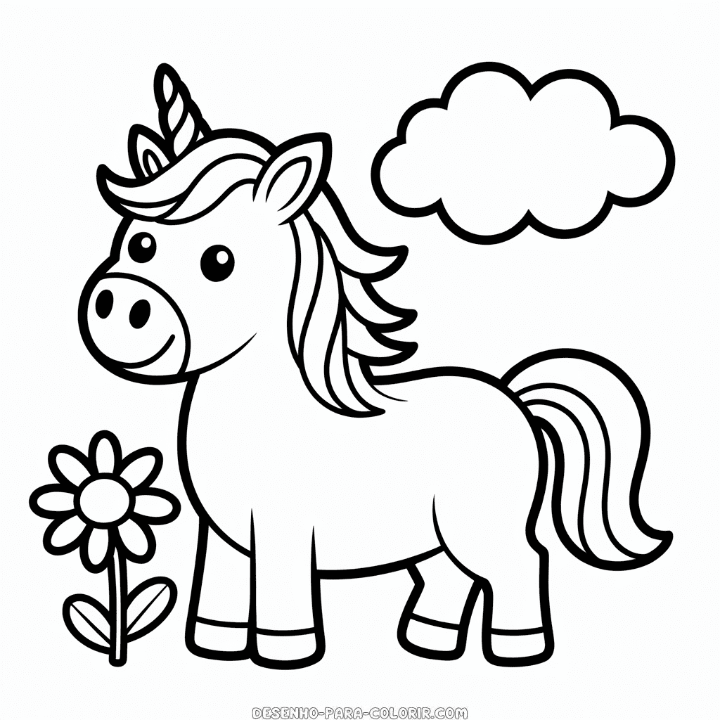 Desenho para colorir grátis de Unicórnio Desenho Animado Fofo, retratando um encantador unicórnio em estilo desenho animado, perfeito para aguçar a criatividade das crianças. Imprima e colora esta ilustração fofa de unicórnio para diversão e aprendizado dos pequenos. Imagem PNG de alta qualidade, em preto e branco, otimizada para impressão em PDF formato A4.