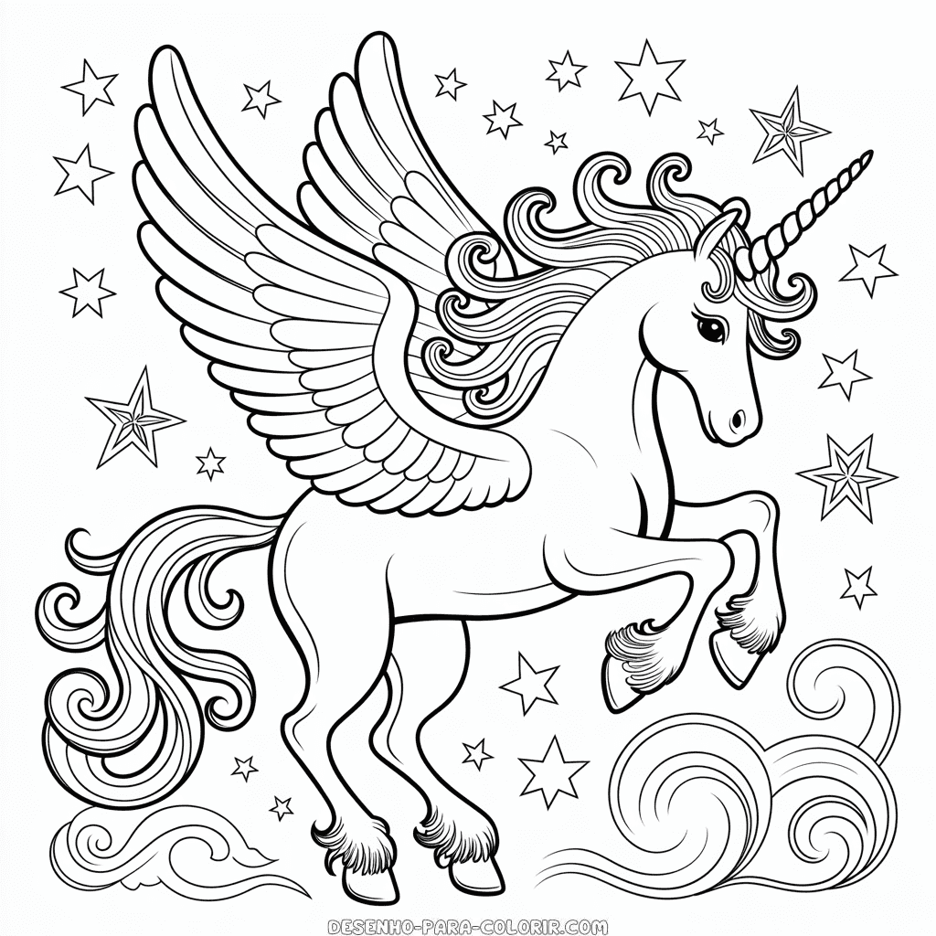 Desenho para colorir grátis de Unicórnio Difícil, um tema encantador e desafiante que promete horas de diversão para as crianças que adoram unicórnios. Imprima e colora esta ilustração complexa com a figura de um unicórnio mágico, perfeito para pequenos artistas. Imagem PNG de alta qualidade, em preto e branco, otimizada para impressão em PDF formato A4.
