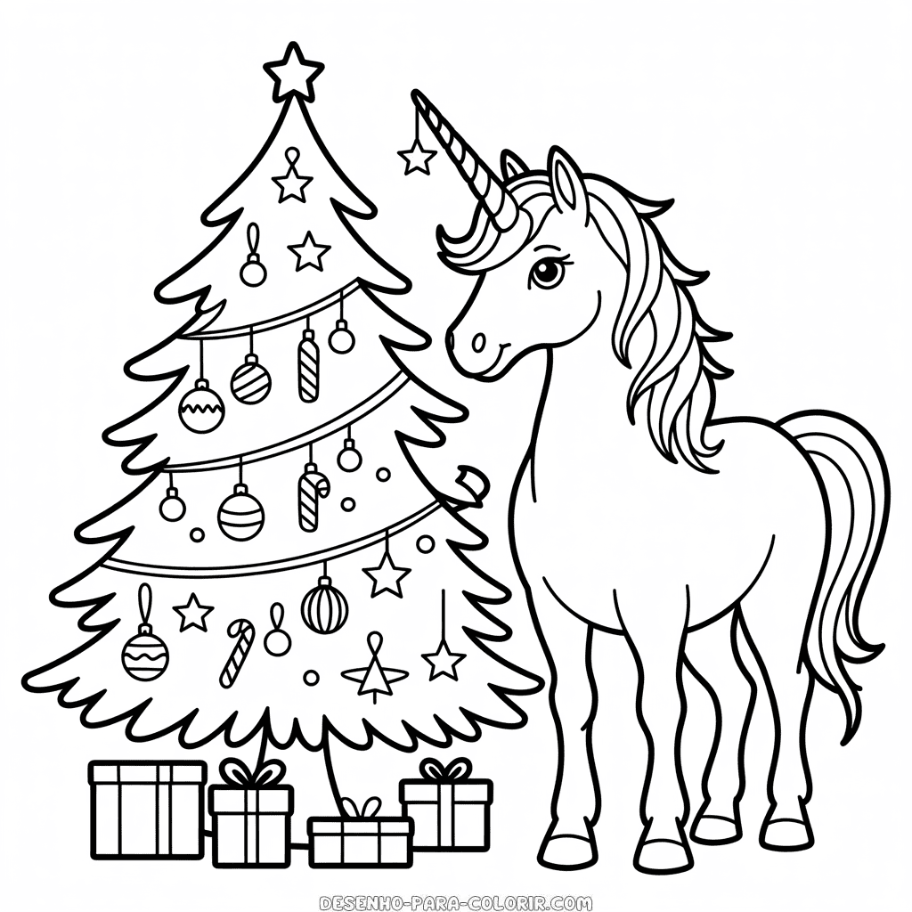 Desenho do Unicórnio e da Árvore de Natal para Colorir