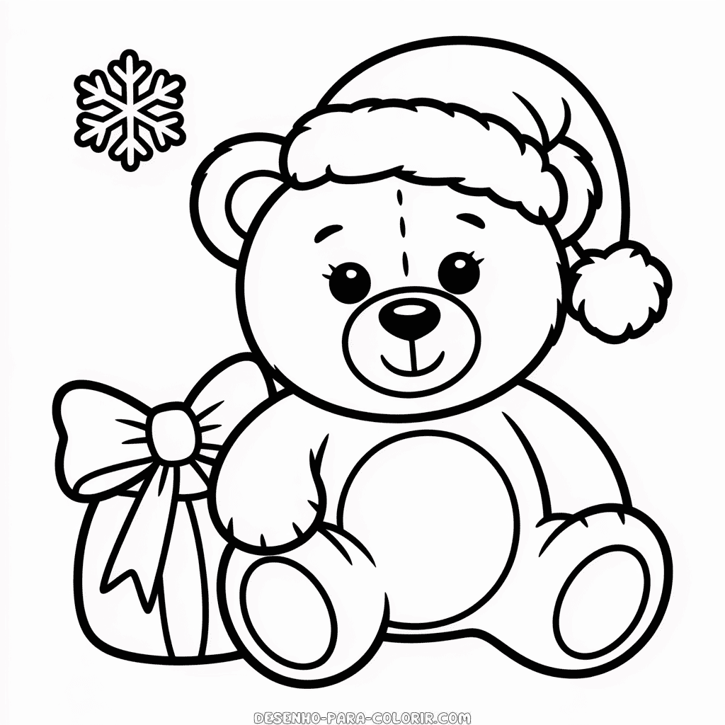 Desenho para colorir grátis de Ursinho Natalino Fofo, um adorável urso vestido para as festividades de Natal, pronto para aquecer corações e iluminar sorrisos. Imprima e colora esta ilustração do charmoso ursinho natalino, perfeita para as crianças se divertirem durante a época natalina. Imagem PNG de alta qualidade, em preto e branco, otimizada para impressão em PDF formato A4.